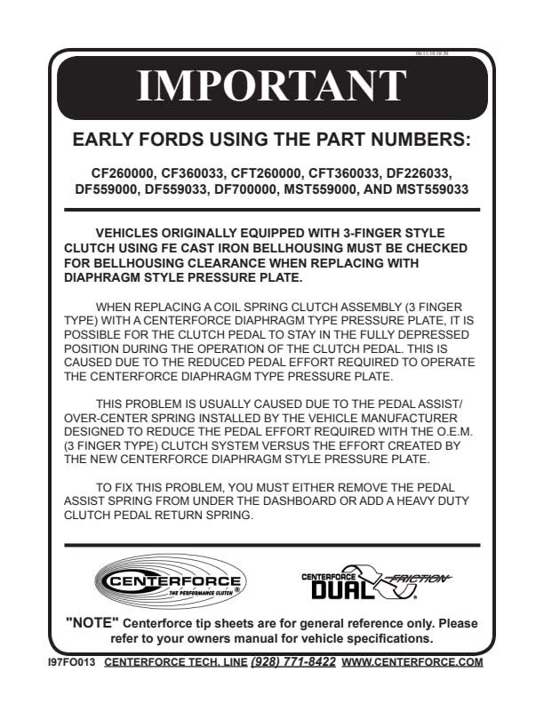 The Centerforce(R) Dual Friction(R) Clutch Series is a performance matched pressure plate & disc combination featuring the patented Centerforce centrifugal weight system (where applicable) and specialized machining processes to provide a performance clutch that offers exceptional street characteristics, while offering outstanding holding-capacity and durability. Furthermore, the Centerforce Dual Friction disc has an organic full facing on one side for longevity and an organic segmented facing on the other side providing increased holding capacity. Some applications have the organic segmented facings of both sides. The Dual Friction clutch is engineered for those who are looking for the ultimate in street/strip holding power and performance without sacrificing pedal effort and driver control. While the Dual Friction has been engineered primarily as a street clutch it can be used in mild competition applications.